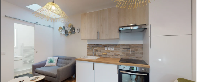 La cuisine ouverte, astucieusement agencée, est entièrement équipée avec un réfrigérateur, des plaques de cuisson et une hotte. Une chambre et une salle d'eau équipée d'une machine à laver complètent ce bien.