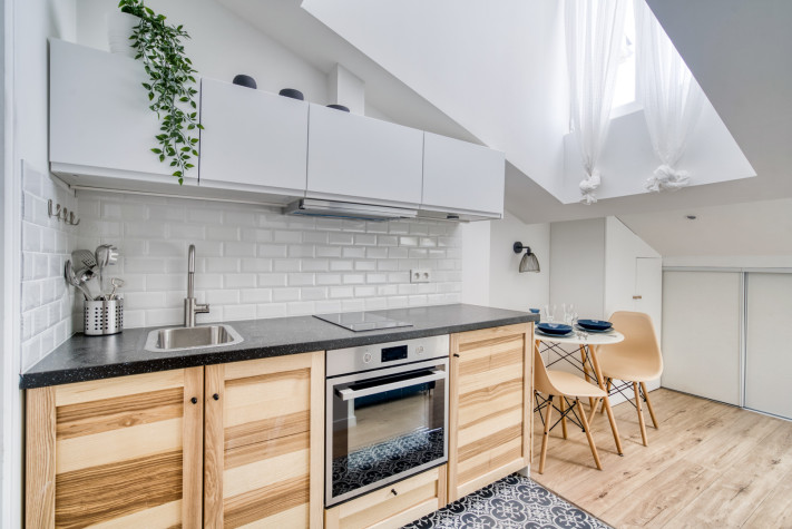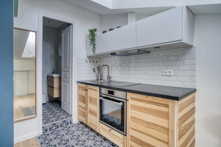 Composé d'une pièce principale, d'un coin cuisine équipé (lave-linge, réfrigérateur, plaques de cuisson, micro-ondes, four, vaisselle, hotte, etc..) et d'une salle de douche avec WC.
